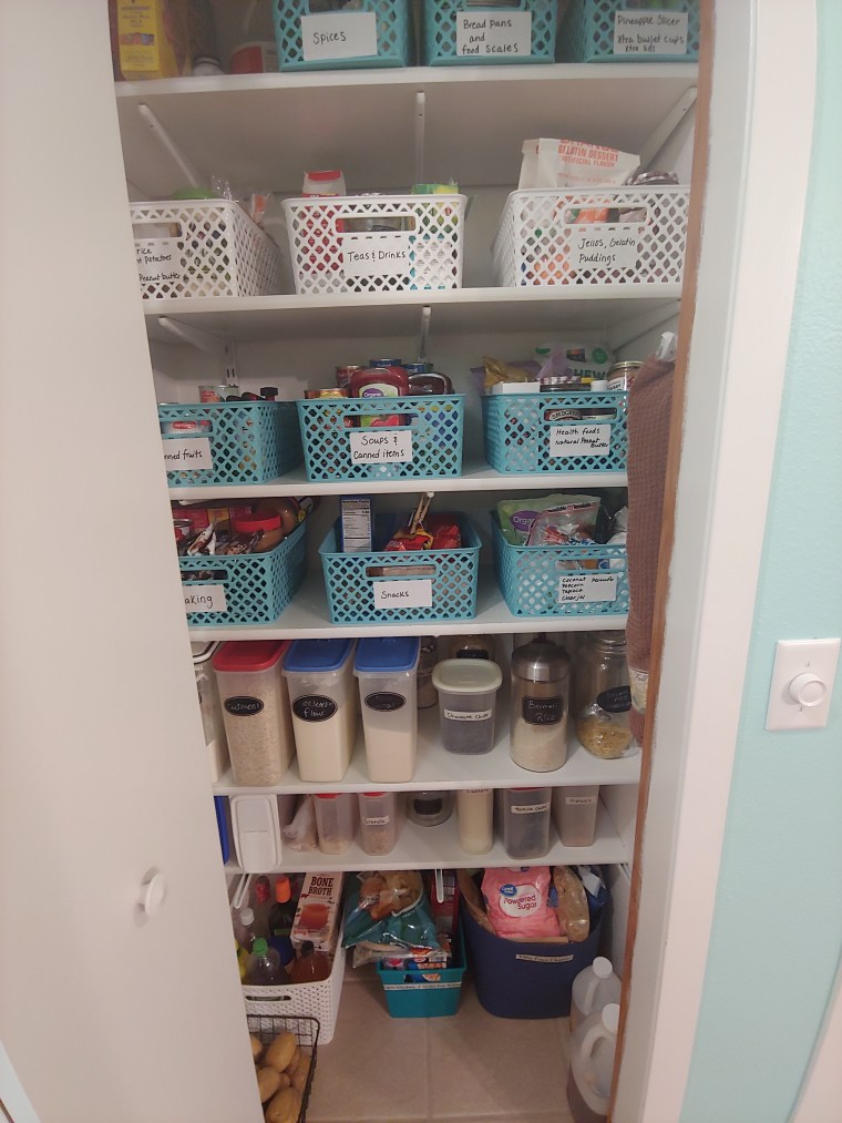 My most problematic area is the floor space of my pantry. It’s all too easy to plop bags of stuff in there and shut the door. I try to only allow that if it’s temporary. Like, if I’m going to be using a lot of it in the next few days, or if I simply don’t have the time to put things in their designated spots as soon as I get home with groceries. But the next day or as soon as I can, I try to put things away respectably. I’ve learned that large baskets help so much to control the chaotic prone atmosphere. I keep extra things in the baskets like flour, sugars, oatmeal etc. I like how I can fill up my flour or oatmeal containers, and if it’s the last I have of it, it gives me time to buy more before I’m completely out.