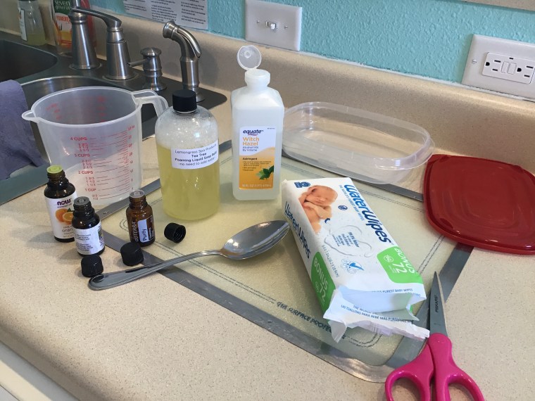 Witch hazel can be found in the health and beauty department at Walmart. They also carry the Water Wipes in the baby department or you can find them at Target too. The Liquid Castile soap we buy by the gallon from Amazon because it’s a staple in our house. Or you can also find it in most any health food store.