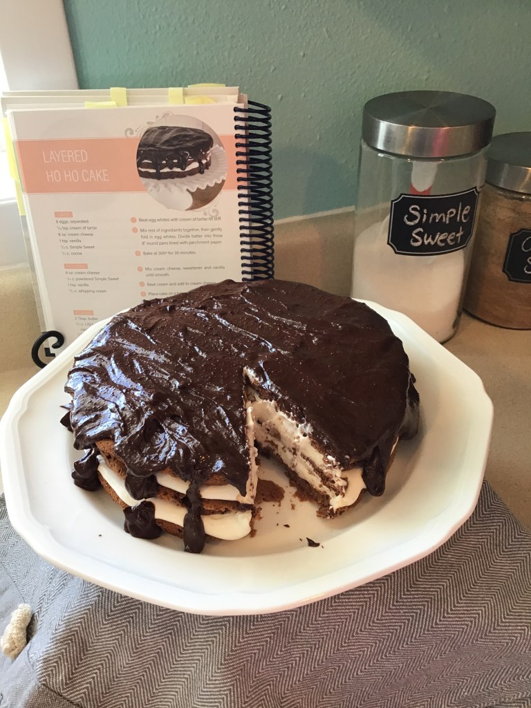 Mix cream cheese, sweetner and vanilla until smooth. Beat cream till stiff and add to cream cheese. Place one cake layer on plate or stand and spread on half of filling. Place another cake on top and spread with remainder of filling. Top with last cake.