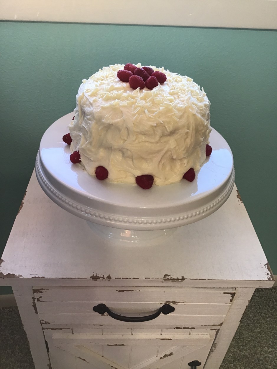 Mix a white cake mix using directions on box, then melt 4 oz. baker’s white chocolate and beat into cake batter. Divide batter into 3 8” round cake pans. I first line them with wax paper then spray them well so they will release easily. Bake at 350* for 18-20 min. Flip onto wax paper lined plates to cool.