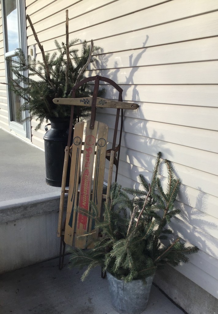 This farmer, Kevin Compton, that’s shaking hands with Jerald is retiring and selling all his equipment with BigIron. Some weeks ago when Jerald was listing his equipment he noticed an old runner sled in one of his sheds. Jerald knew I was wanting one so he asked Kevin if he would sell it. Kevin wasn’t sure as he had bought it around 1980 for his children and he wanted to check first with them if they wanted it. And can you believe it they did not?! So on the day I rode with Jerald, I met Kevin and he wanted to give me that sled! I was pleased as punch!! I’ve always thought an old sled would be perfect for porch decor but the price? Not so perfect. And now I’m simply given one!! That very evening I washed it up, trimmed the trees, gathered sticks and…. oh joy! I love it! Fresh cut greens are simply perfect for making large outdoor bouquets. I fixed three of them before I said “enough”. Tuck in some broken branches, a few pine cones and you have pretty decor that didn’t cost a penny. I rebuked myself for not garnishing my porch with greens weeks ago. Simple but beautiful! Especially with a free sled!!