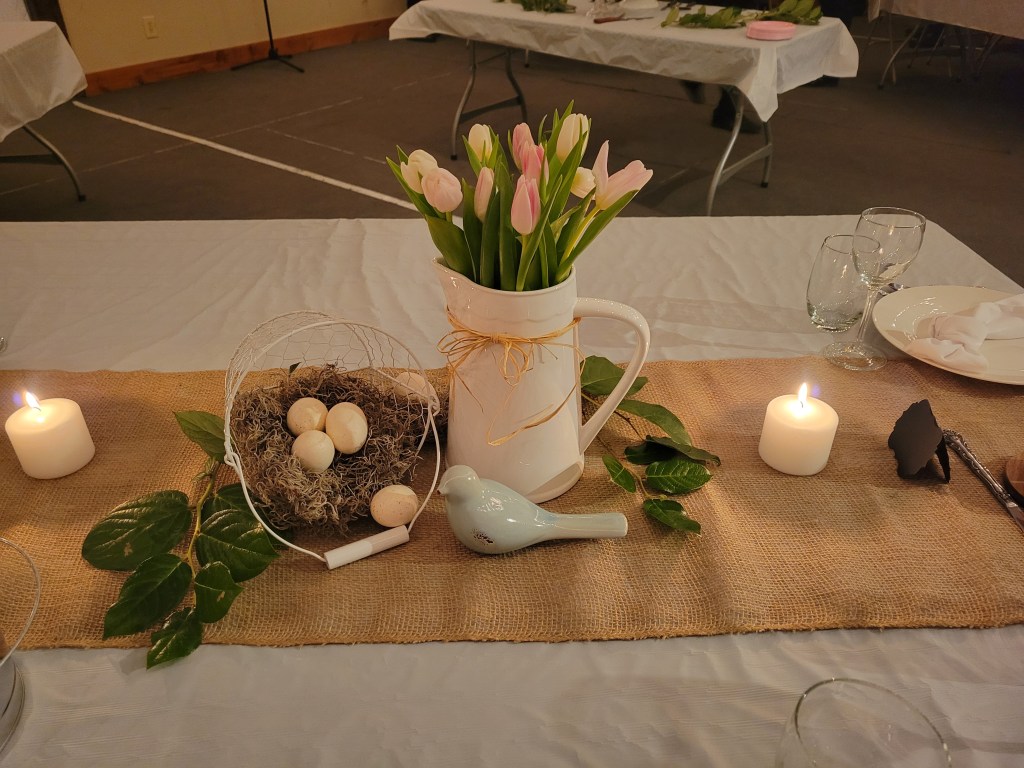 Then early one morning sleep eluded me long before I wanted. When you can’t sleep you start to think before you even think about thinking. My brain piled up with a thought jam. Since I was already thinking, I began thinking of potential centerpieces for the Banquet. I prayed a little prayer asking God to help me know what I should/could do for centerpieces. In a couple minutes tulips entered my thoughts. “Yes, pink tulips! With bird figurines, eggs and baskets!” It was an instant thrill, and that was settled. “Thank you God!” Of course I wanted to ask the other committee ladies what they thought of the idea before I forged ahead.