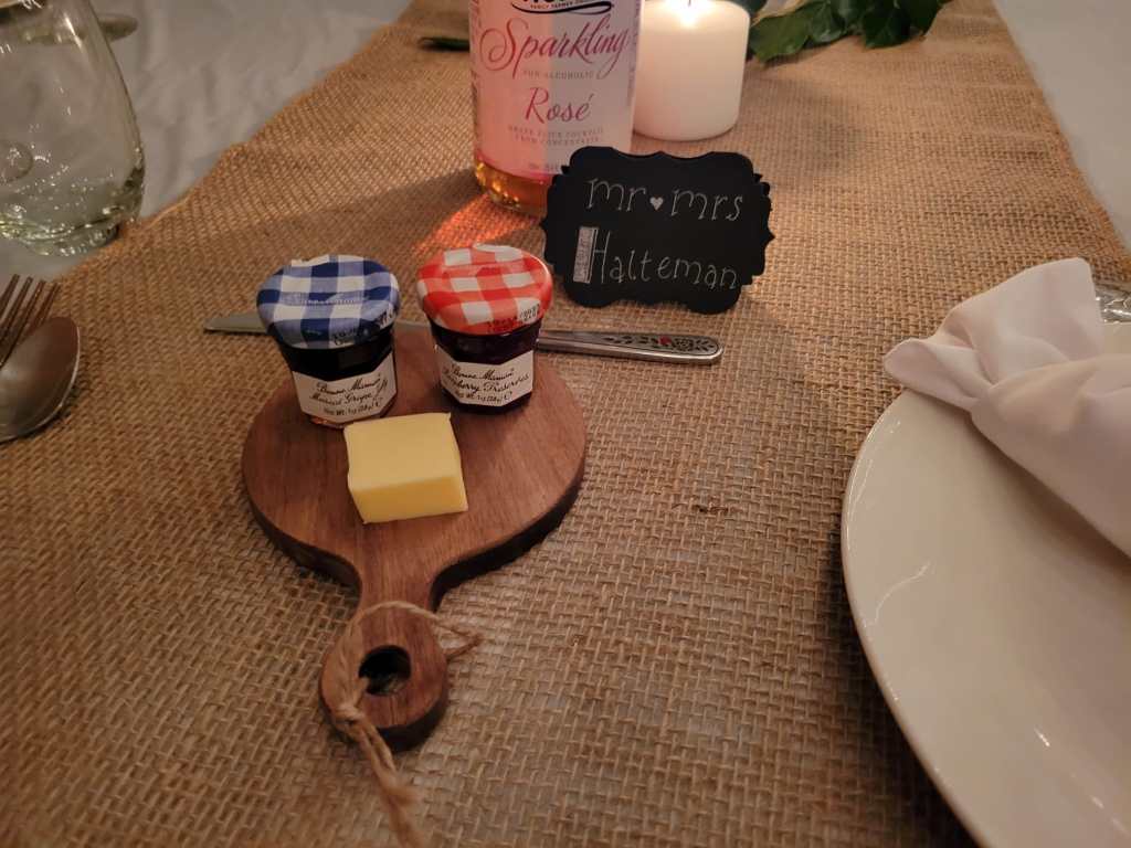 I found the cutting boards at Hobby Lobby and the mini jam jars we ordered from Amazon.