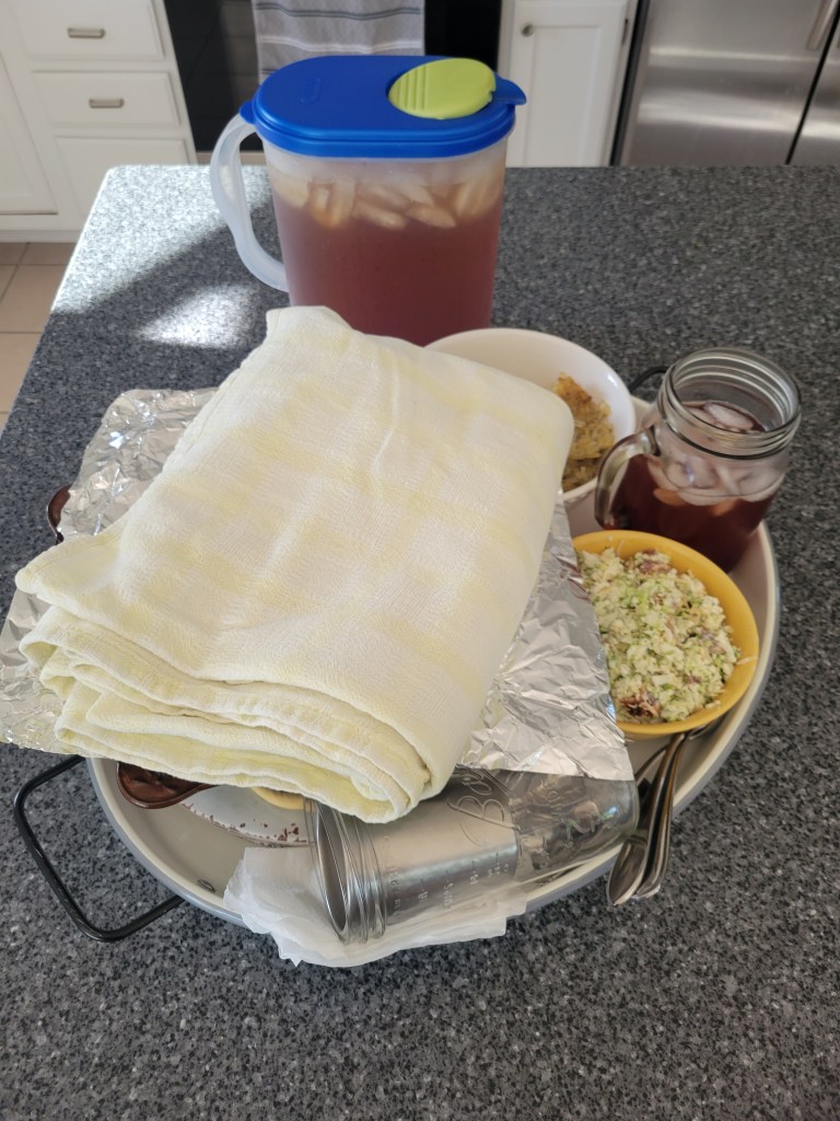 I keep a beautiful Hearth & Hand magnolia tray that’s extra large, within easy reach. This was a Mother’s Day gift from my husband one year and I love and use it so much! On this tray I pile our food, utensils, plates, cups etc. Utilize every possible space. On top of the plates I’ll set the casserole dish or a bowl of food. Stack the cups together. On the very top I throw on the tablecloth. There might be a pitcher of tea and maybe one or two other items to carry separately but my big tray holds 90% of things.