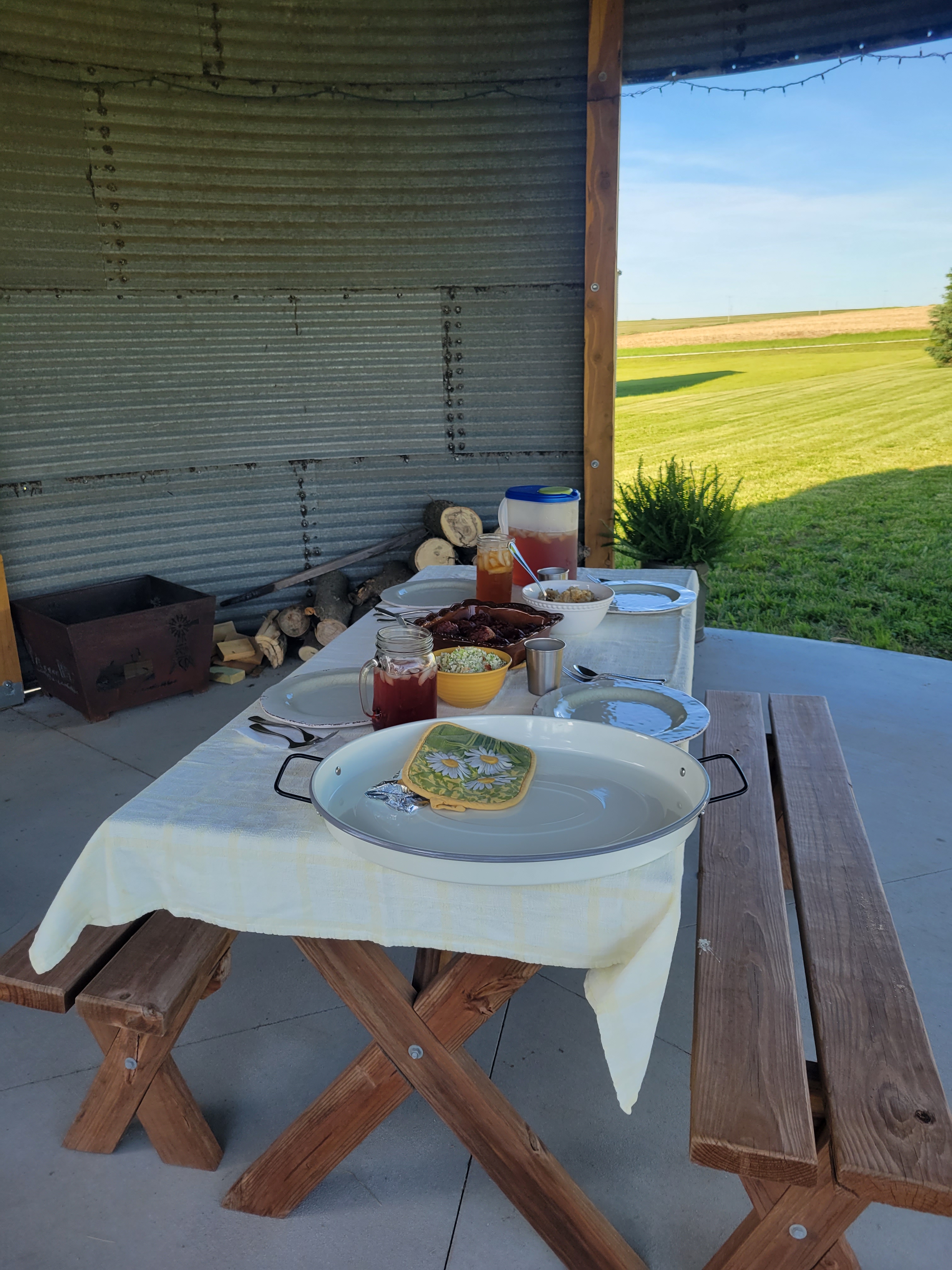 Then you just haul it outside. You’ll need the tablecloth first so that’s why you place it on top of everything else. Throw that on the picnic table (or grass), then set out the plates and food and voila! You’ve got an outdoor meal without making a dozen trips back and forth!