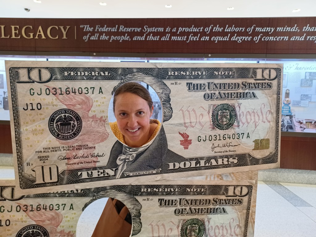 We walked up the streets to visit the Federal Reserve Bank to learn about Federal reserve notes. These are the kind of notes everyone loves because they’re worth so much! Watching the inspection of bills was informative and super interesting. The machine is hand loaded with bills. The machine checks each bill for counterfeits, graffiti, or tears. When one is discovered, it automatically shreds it and a brand new bill gets put into place. This way the exact dollar amount stays the same. The robots moving pallets of cash was intriguing. The realization of the billions of dollars so close to you and yet so far, was fascinating! One full pallet of $100 dollar bills is worth 64 million!!! If the vault is full of 100 dollar bills it would equal more than 138 billion!!!! And we were right outside the window of these millions of dollars!! The thought was enriching.