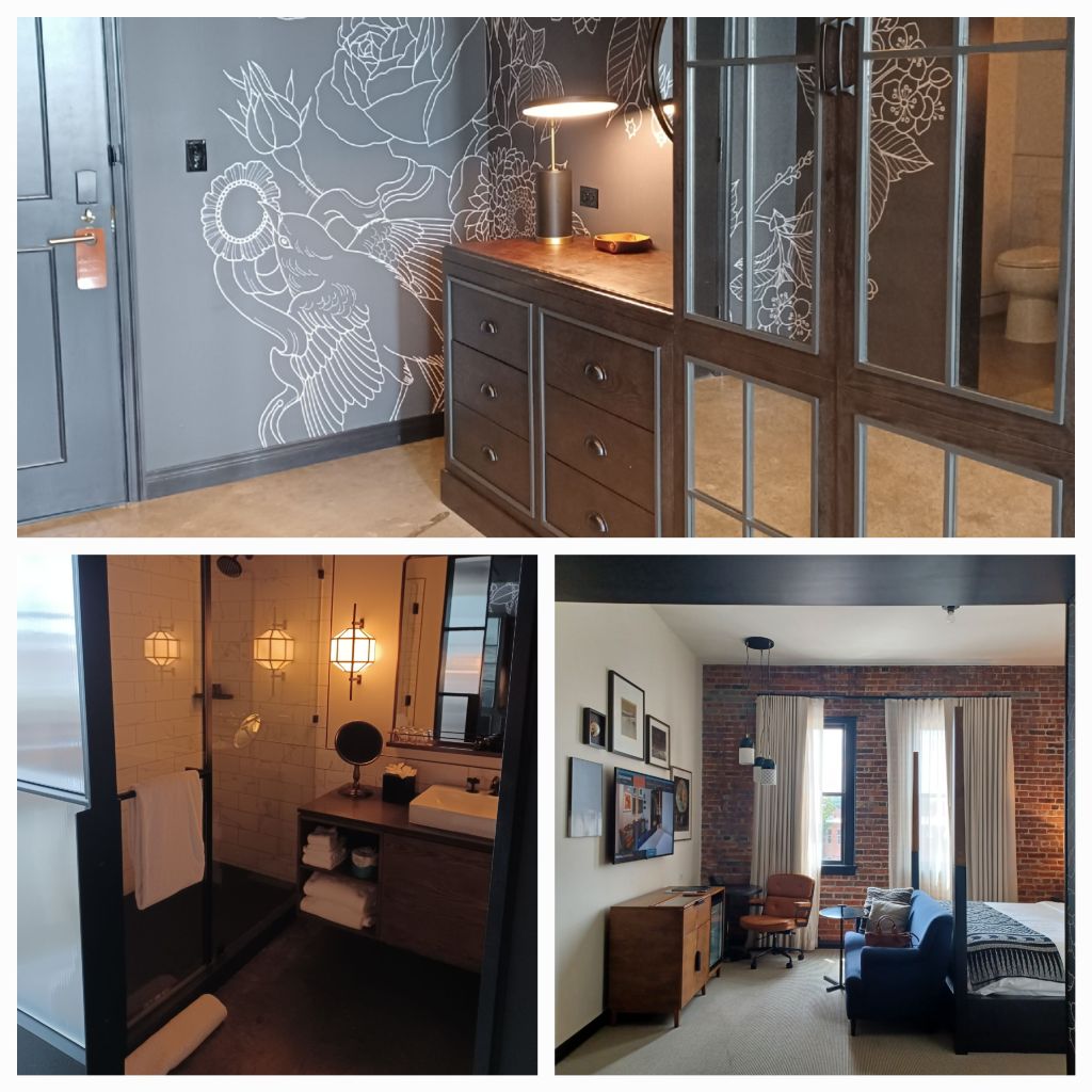 But there was none of this since my hubby is not in the habit of bed jumping or hollering. We could simply lounge around in the unique, old fashioned hotel. The room was completely adorable and the glass, walk in shower luxurious. We headed out around 5 to eat supper and do some shopping.