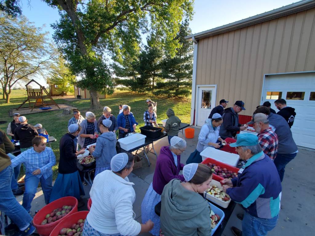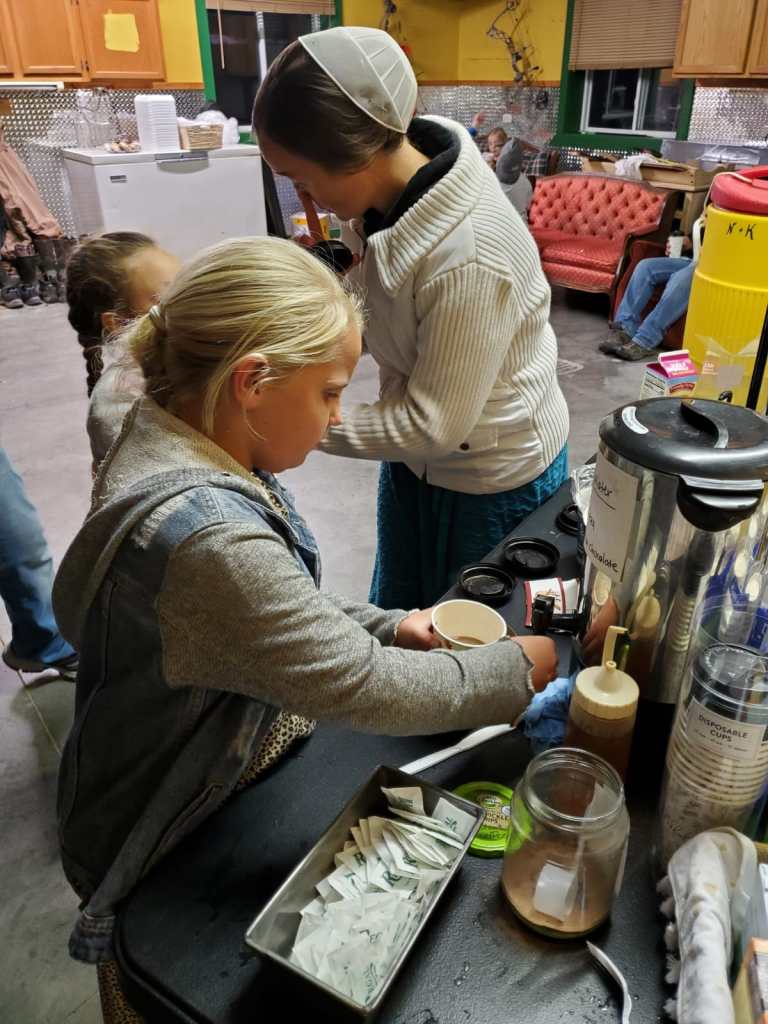 There’s always a hubbub of working people all around. Even a bunch of the men were snagged into washing and cutting spots off the apples, because there were not enough men type of jobs for them all. Then there’s also the kind of people- (some little and some big!) who need to hold down chairs, sample hot drinks and exercise their vocal cords. (And we need them too!)