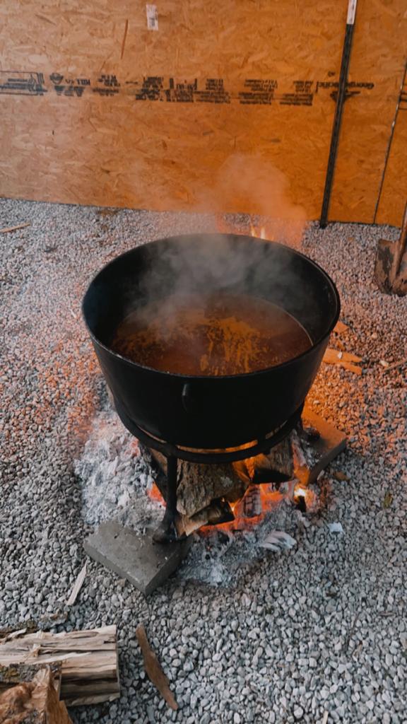 So Thursday I hauled off to town to fetch the vegetables and Jerald ordered in and picked up the stew meat and beef bones. Friday morning I spent about 3 hours peeling, and dicing vegetables and frying up the meat. I must say I felt like I’d nearly done a day’s work by the time that was accomplished. After all my hustling with the cider jugs that night, I was completely exhausted. I didn’t actually feel that bad because I was running on adrenalin. It was midnight till we dropped into bed!