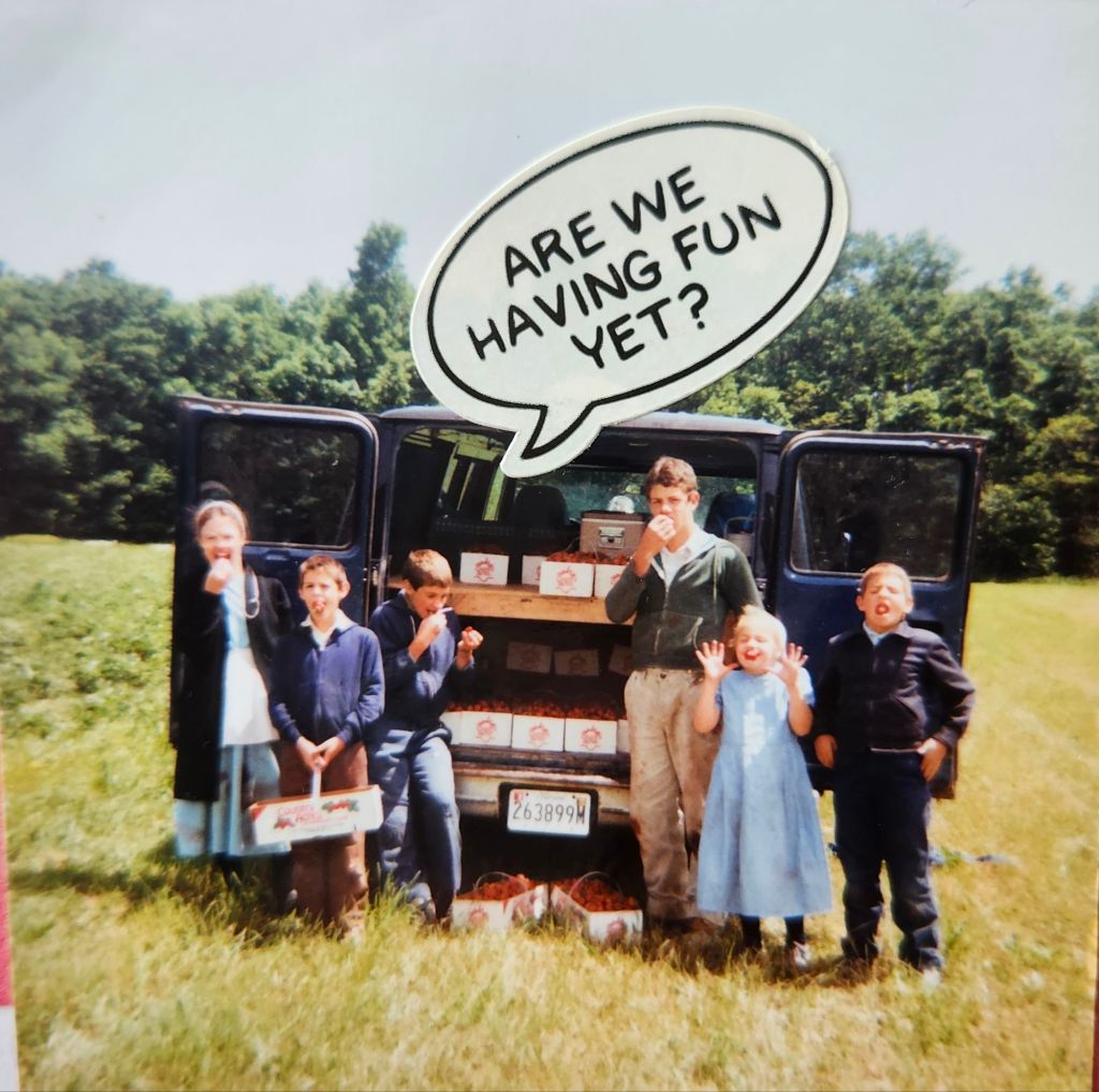 Many years ago, our family picked strawberries to fill orders for Mausts Strawberry Farm in Accident, Maryland. We’d leave early and pick before it got too hot. Mom would pack cereal boxes and milk in a cooler. Breakfast was completed with a side of fresh berries. I’m the little girl in blue and suspicious I wasn’t much help🤠This is a picture of an old scrapbooked photo, hence the caption.