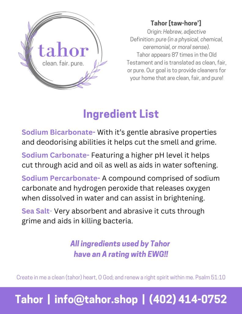I have been intentional in the past with not running ads on my blog. Now here I am, advertising right in your face! Tahor (pronounced taw-hore’) is our business name. Tahor is Hebrew and means clean, fair, pure. It is found over 80 times in the Bible. One common verse that uses this word is Psalms 51:10- Create in me a clean (tahor) heart, O God; and renew a right spirit within me. This is what we want our products to be- clean, no fillers, yet safe ingredients that clean well.
