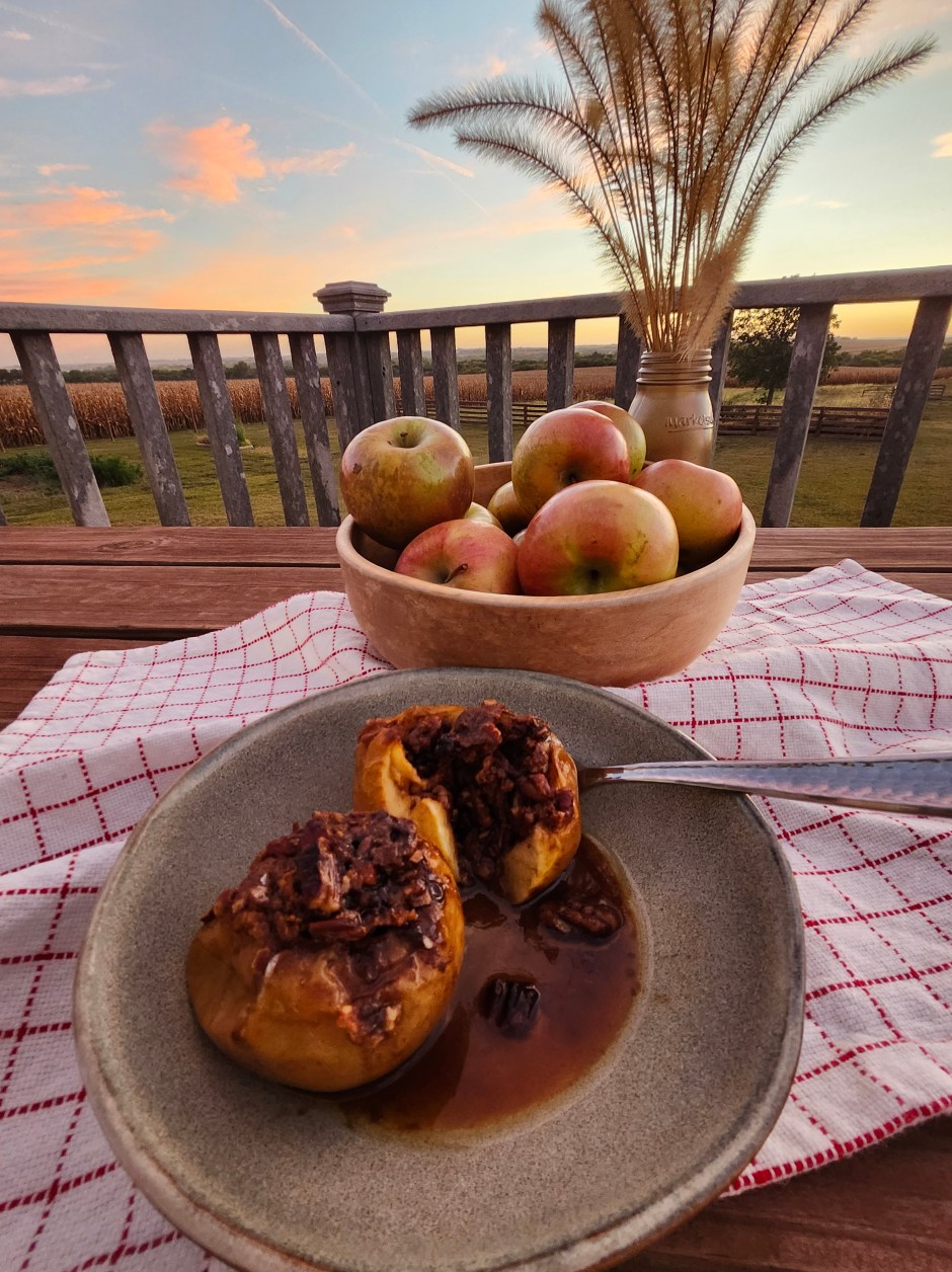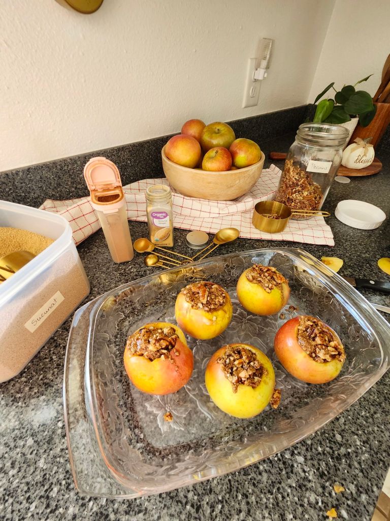 Take 4-6 apples and carve out the insides as much as you can without hitting bottom or ruining too much good flesh. I used a knife and grapefruit spoon. Then fill the cavity with this mixture: