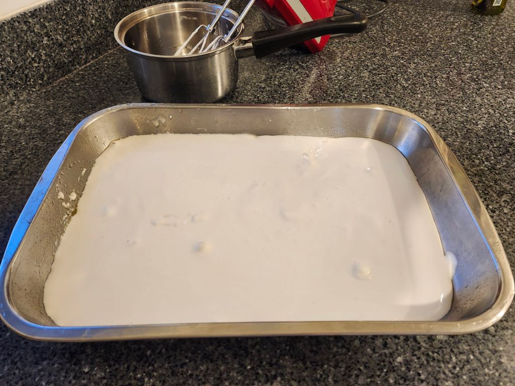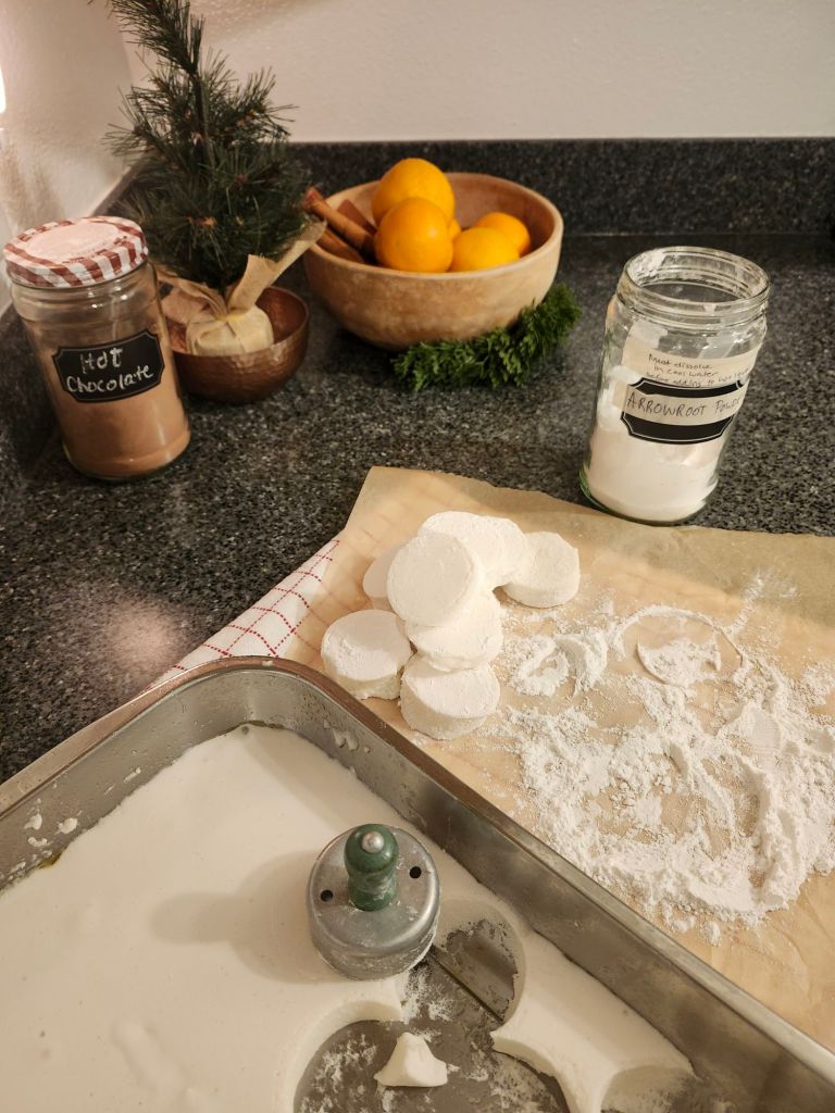 This marshmallow recipe is also not original with me, but I changed it up a bit as to how I make it. And honestly, I was out of vanilla so mine didn’t even get that. I’m sure it’s a good addition though. I used a 9×13 pan but it made thinner marshmallows. So I’d recommend a smaller pan if you want a thick version.