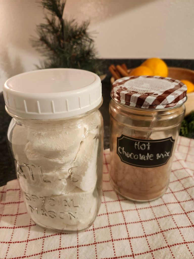 On a shivery sort of day, my children love hot chocolate. When I was growing up, we made our own mix each fall. Many winter mornings we enjoyed a hot cup of chocolate. And often for an after-school snack too. Mom and Dad put restrictions on how many cups we could have in a day. As for mini marshmallows, those were restricted as well. If I recall correctly, 7 was the alloted number allowed per cup.