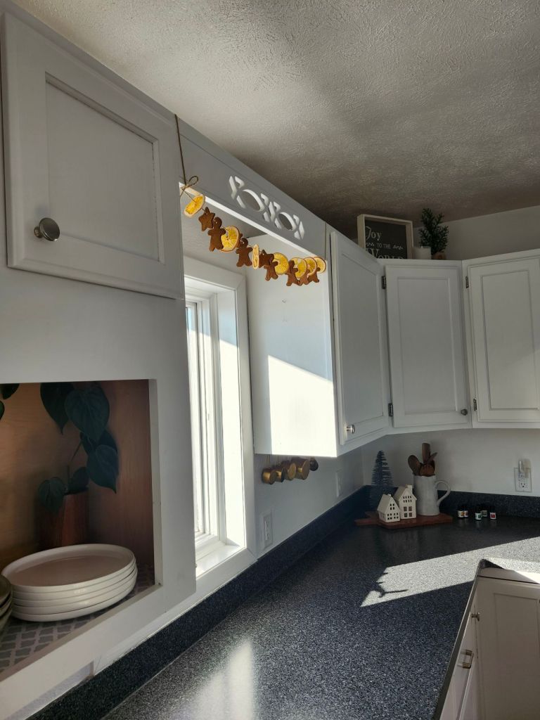 The children also made paper snowflakes to hang by a couple windows. All of these extras hanging around makes things look full and a mite cluttered, but I’m OK with it because it’s temporary. And its cheap, simple fun for children and their mom.