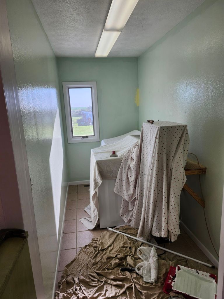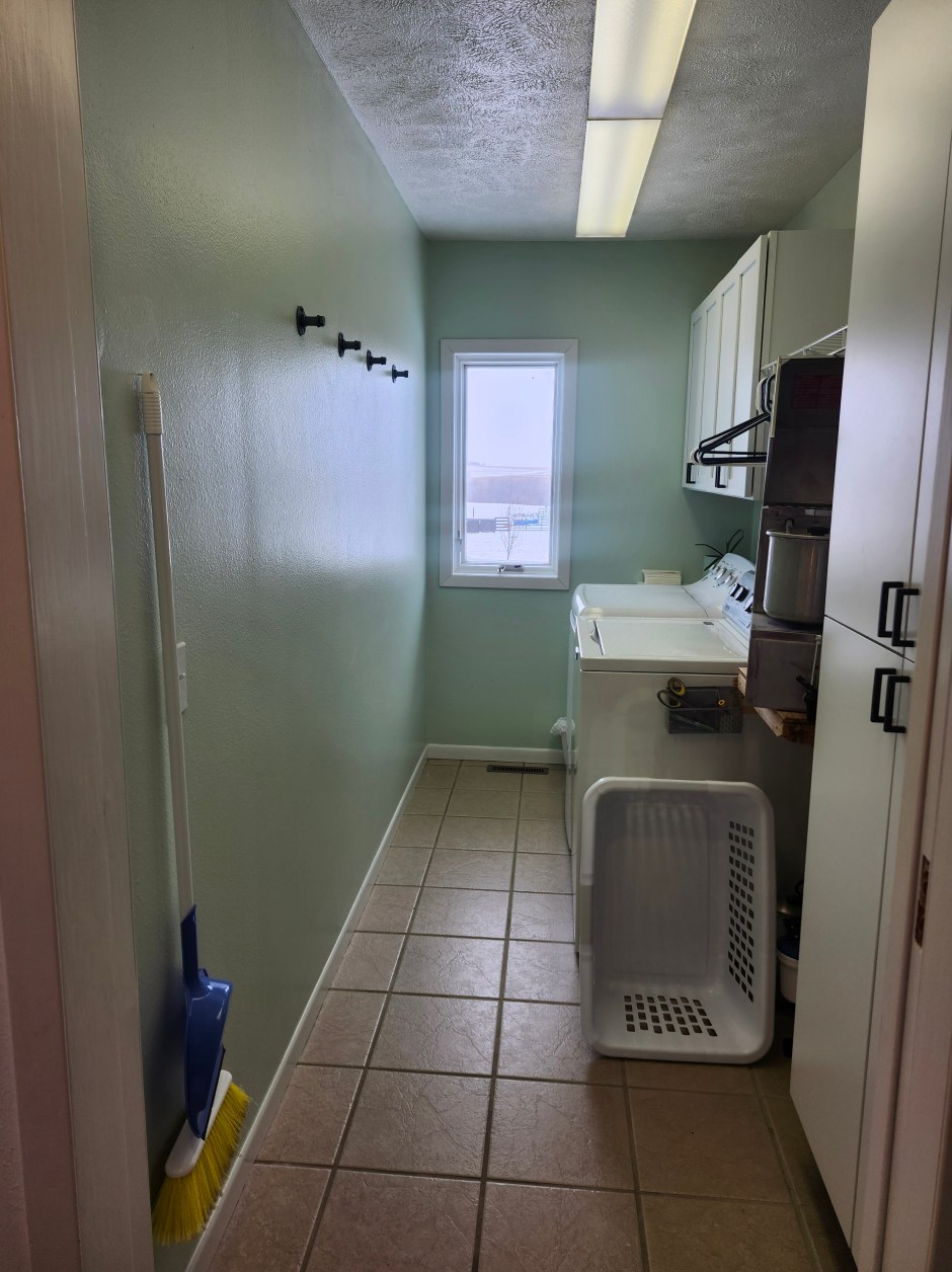 Here’s a couple pictures of our laundry this past summer when we repainted it and installed a few cabinets.