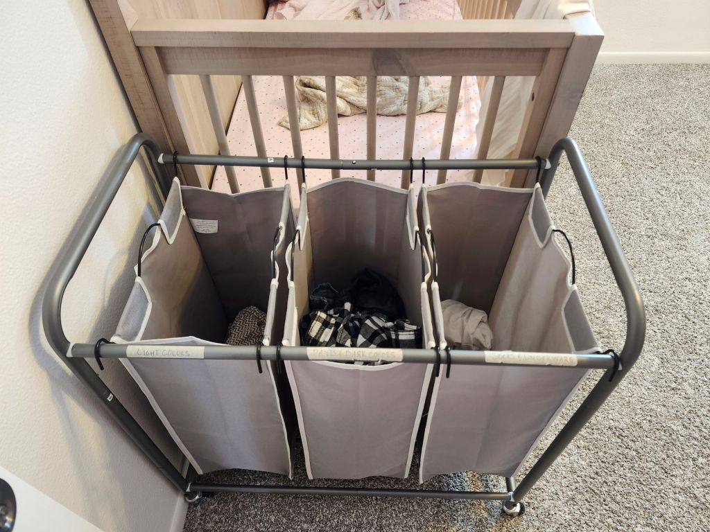 I’m still not in love with laundry, but the dread has lifted slighly since I switched up my system. We purchased a three bin, rolling laundry hamper. After showers, everyone throws their clothes into the correct bins and woohoo- sorting is done!