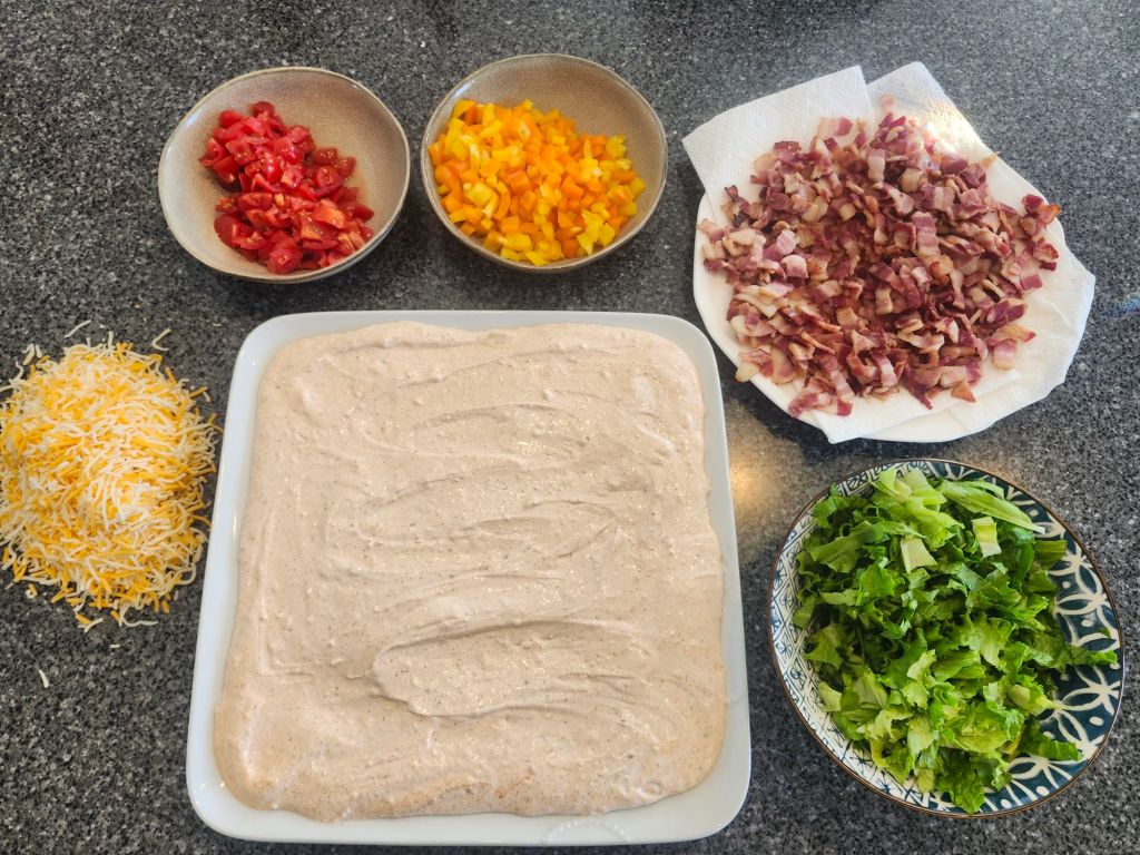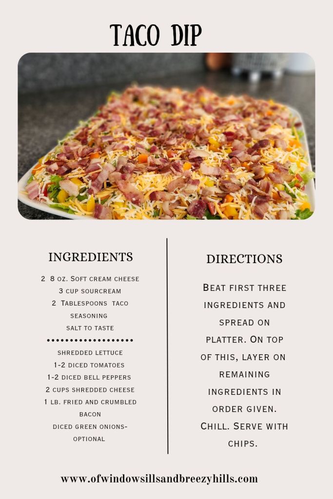 And now for a fun springish kind of recipe! This Taco dip is very light and perfect for a Sunday night supper or maybe an outdoor party. It requires some prepping of ingredients which can be done ahead of time. It doesn’t take long to assemble and can be refrigerated for a couple hours. You can also add a layer of canned beans such as chili, black or pinto, for more protein.
