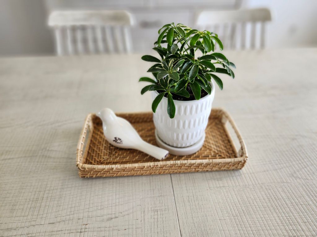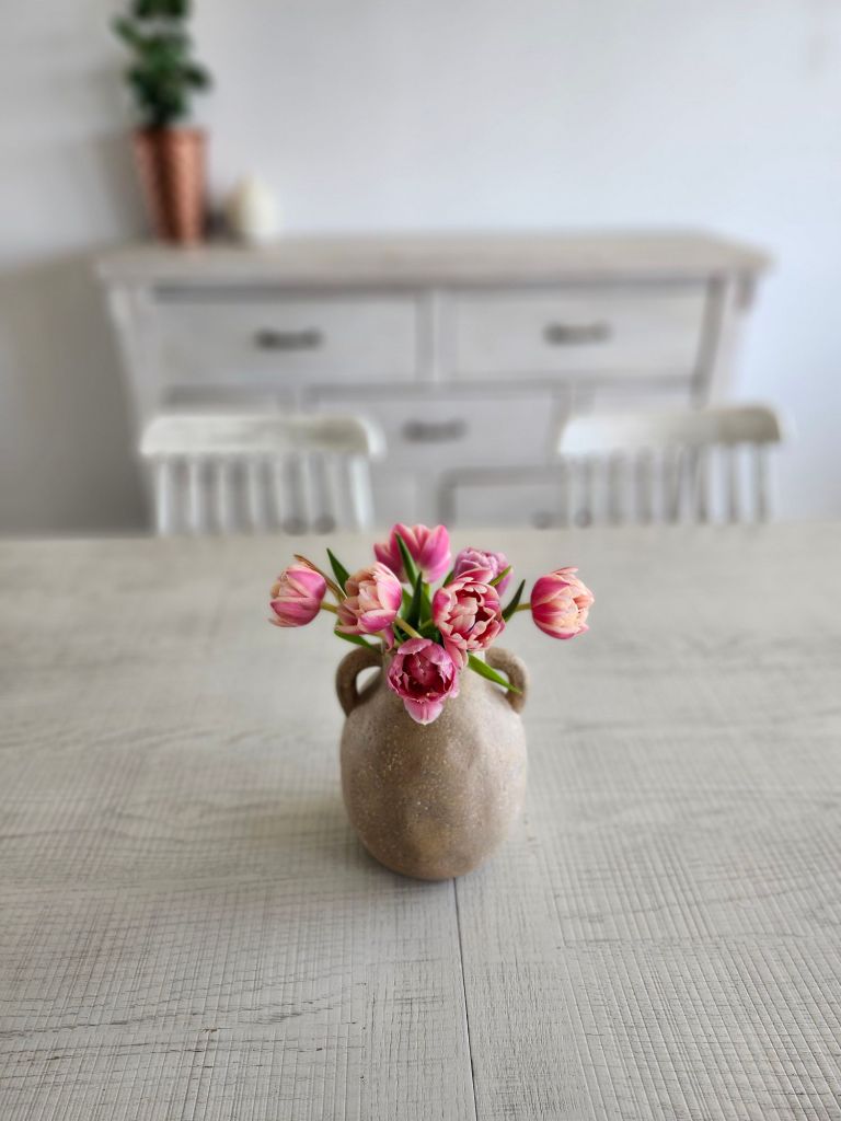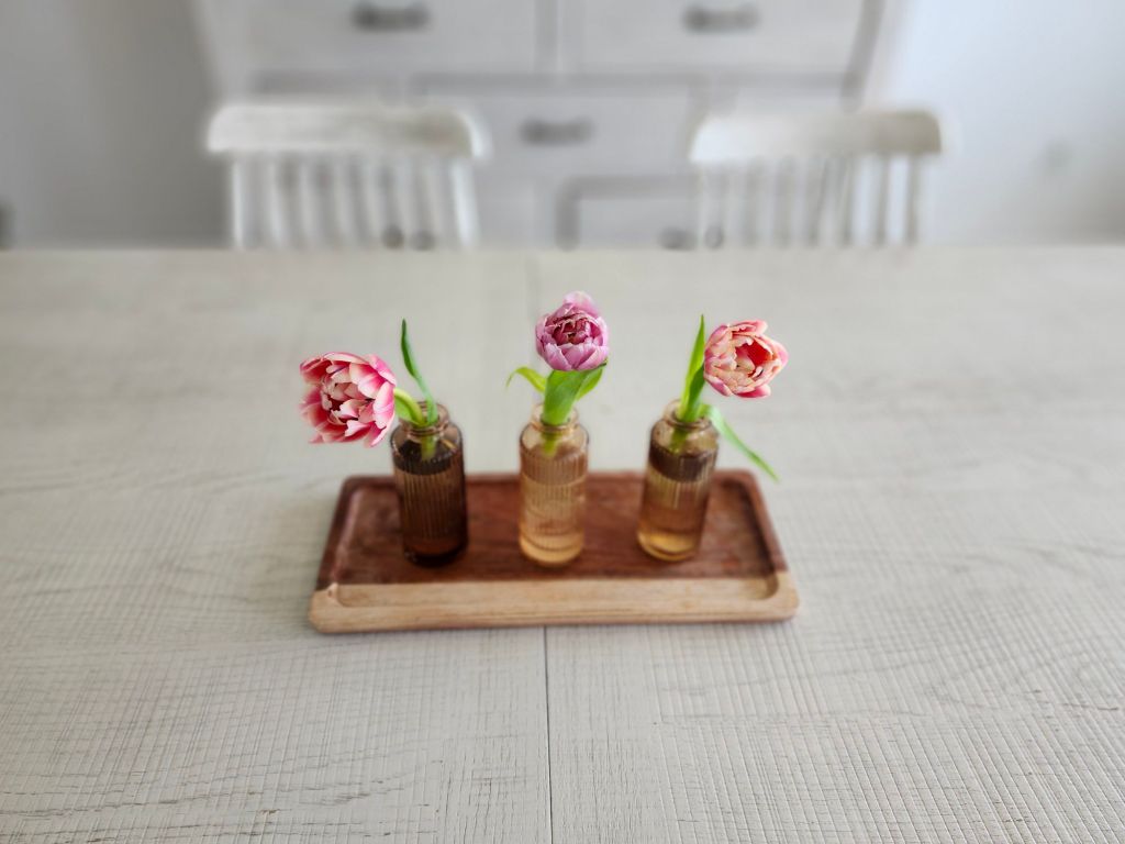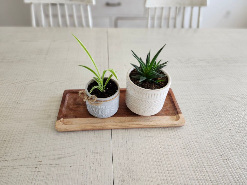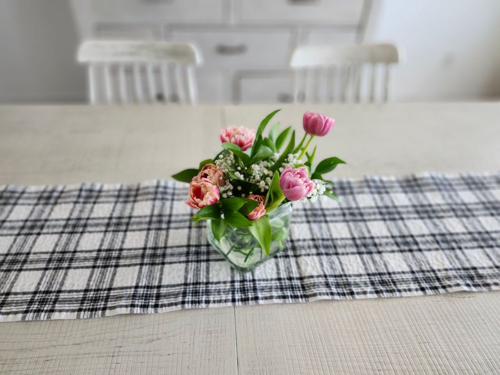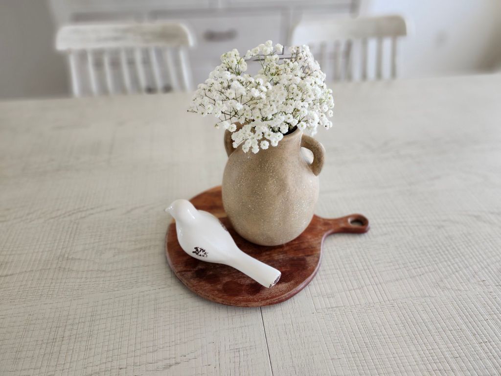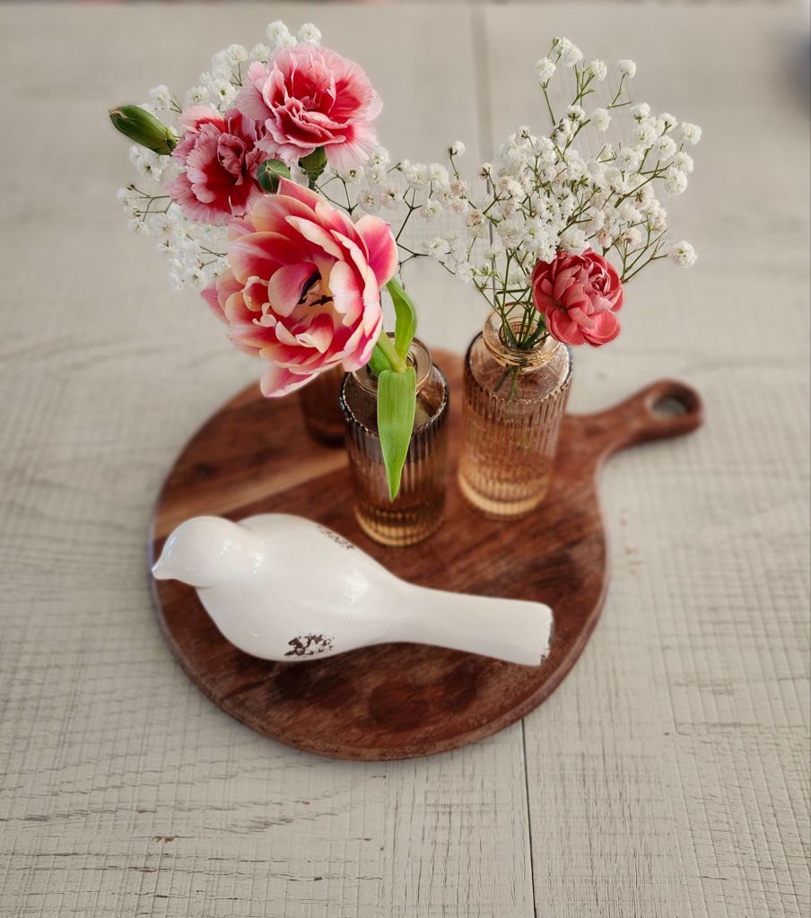 Scattering a variety of mini vases with singular blooms down the center of the table gives a unique twist. I’ll admit, I didn’t like my try at this, but it gives you the idea. I liked the mini vases on the wooden tray better. I loved the pottery with baby’s breath and white bird. It’s neutral, easy on the eyes and gives peaceful vibes. The pottery with tulips also struck me. Mini fresh plants grouped on a wooden cutting board or tray is also pretty, though it nods more to summer, in my opinion. Adding in small birds or real looking bird eggs in a nest is also cute! I stay away from bunnies and colored eggs because it has nothing to do with the true meaning of Easter.