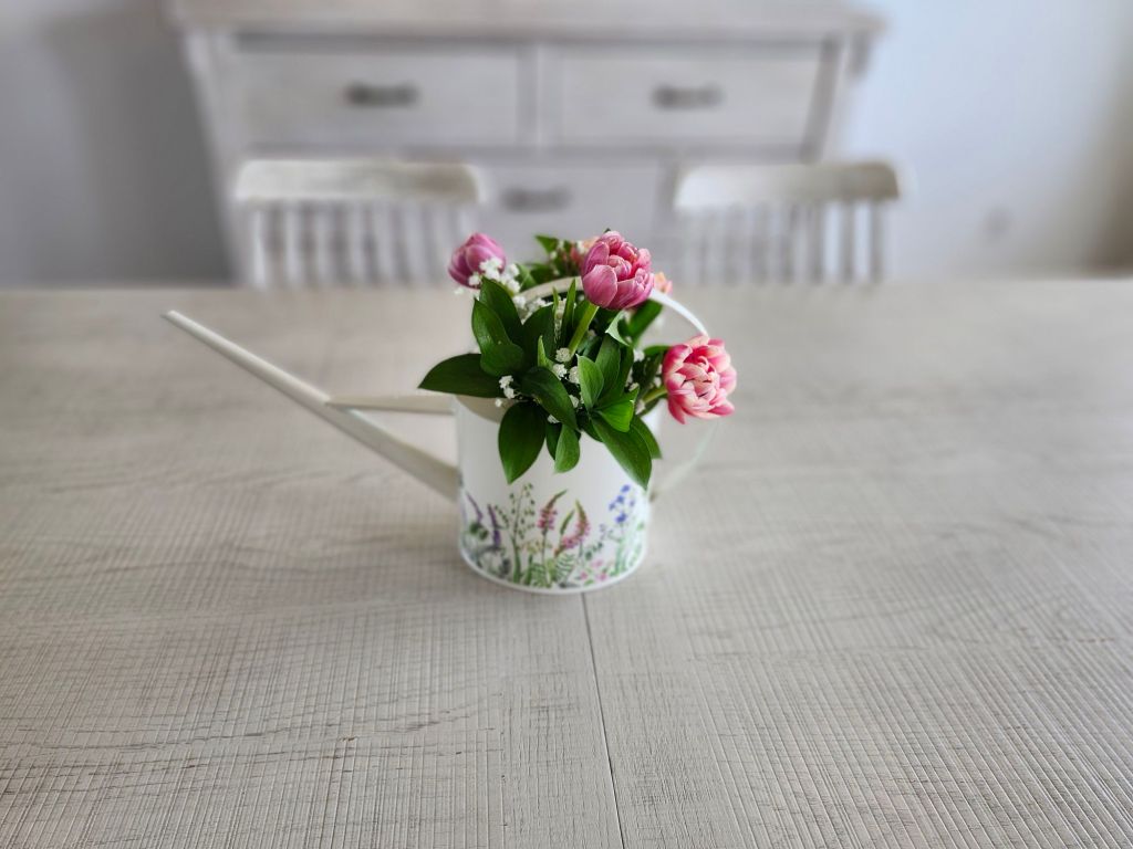 A glass vase or jar is classic, but I’ve learned, if you avoid clear ones, you won’t see the yucky looking water that happens after a couple days. Using a watering can as a vase lends to spring, though I will say it wasn’t exactly my style. I think a cuter watering can would make a difference, but this is what I use for watering my houseplants. If vintage tea cups are your style, that would make a cute vase as well, paired with a small stack of old books. Adding candles always adds coziness, but I don’t use them as much in spring or summer.