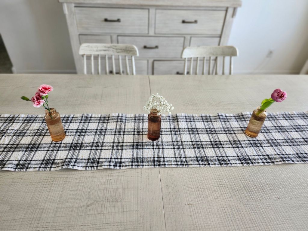A variety of table cloths or runners totally change things up. I don’t use tablecloths anymore except for company. Its cozy, but it feels a mite stuffy for me. The plaid runner is the only one I have, which I use occasionally. But I think that’s why I didn’t like a couple of the centerpieces because the runner didn’t jibe and looked too busy. An earth toned runner might look better with my brown vases.