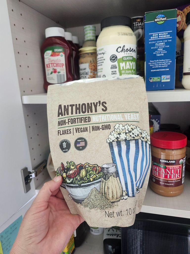Along with seasonings, I’ve used Nutritional yeast for years. We love it on popcorn and avocado toast. I also like it on eggs. But recently learned of nonfortified brands which are a better option. Besides Anthony’s pictured here, a couple more good options are Sari, Foods Alive and THM.