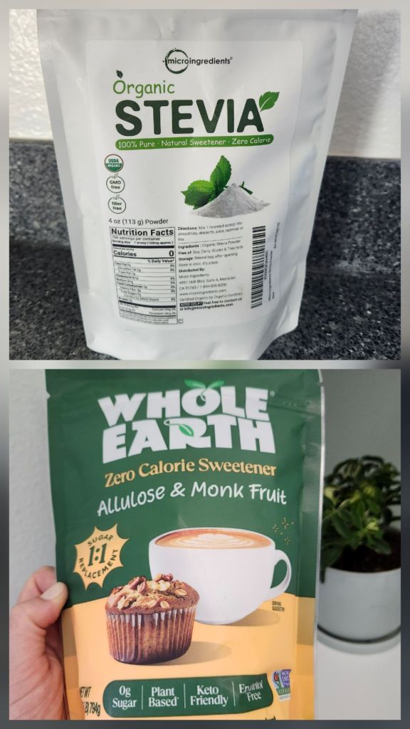 Raw local honey and maple syrup are good options. Store bought honey often has HFCS as filler. I’m learning about Allulose and monk fruit which I believe are both good, but don’t have much experience yet. This package below I found at Costco. Sugar alcohols are debatable. I rarely use them anymore. I still use liquid stevia glycerite and stevia powder for certain foods and drinks. Currently I’m using this organic microingredients stevia powder.