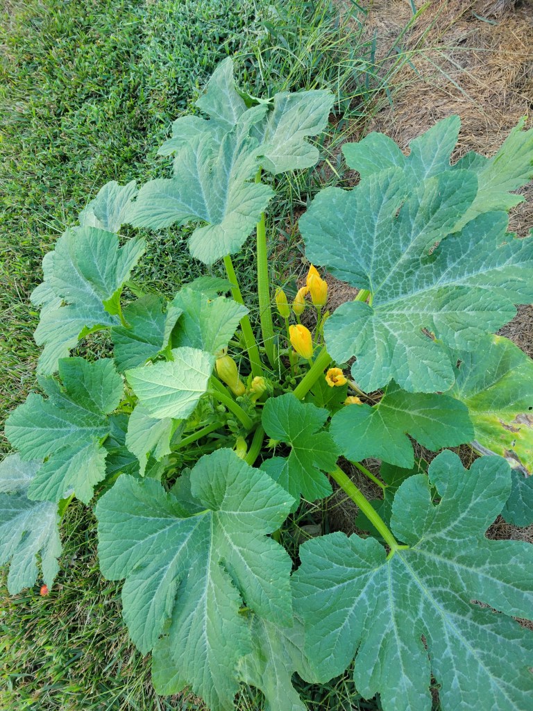 The poor green beans produced a couple pans of beans instead of buckets like usual. We ate corn once and decided we can buy corn on the cob that’s much better, so we never tried it again. The cucumbers gave a measly crop of 3 or 4 tiny ones that were actually eatable. The melons look promising but the coons have been feasting on them well before their time, so we have yet to see if we’ll get to enjoy any. The tomatoes finally started ripening last week. (Way behind times I know, but I’m just grateful to even be getting any!) But that could change too. It’s either feast or famine on zucchini and this year we hit famine. Not only did the zucchini perish but the summer squash died right along with it. I’m holding my breath for this volunteer summer squash at the edge of the garden. Don’t ask me how it got there. Just maybe I’ll get a few to eat fresh?! That off colored leaf there worries me.